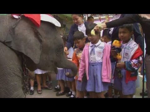 Elephants take on Santa's work by spreading Christmas cheer at a school in Ayutthaya, Thailand. Report by Mark Morris. Like us on Facebook at http://www.facebook.com/itn and follow us on Twitter at http://twitter.com/itn . Subscribe to ITN News! http://www.youtube.com/subscription_center?add_user=itnsportsnews